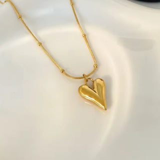 Gold chain necklace with a heart pendant worn by a person with visible tattoos.