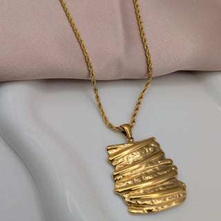 Gold necklace with a textured pendant on a mannequin bust against a white background